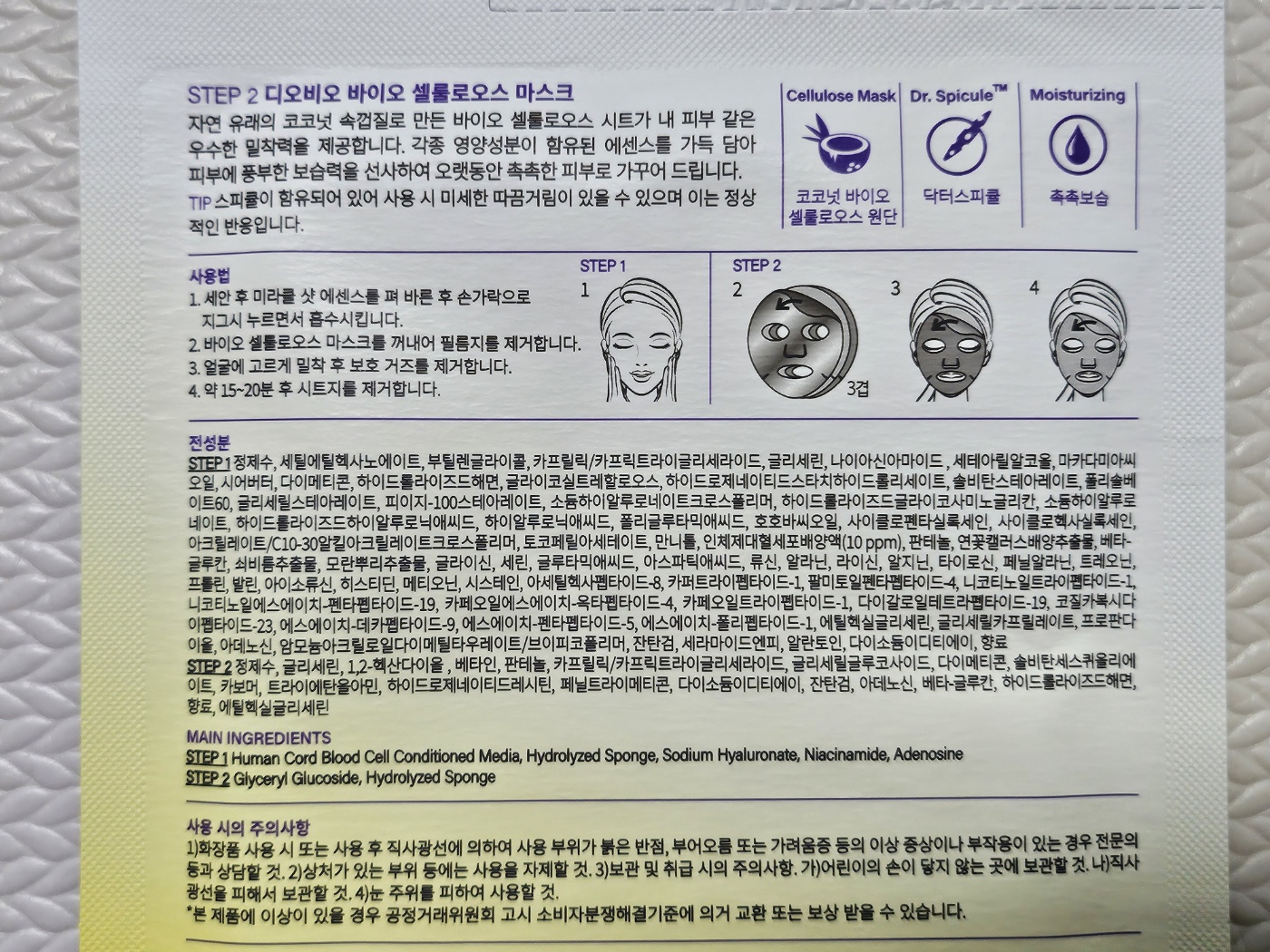 - 2단계: 바이오 셀룰로오스 마스크 (30g) - 피부에 밀착되어 에센스의 효과를 극대화합니다.
