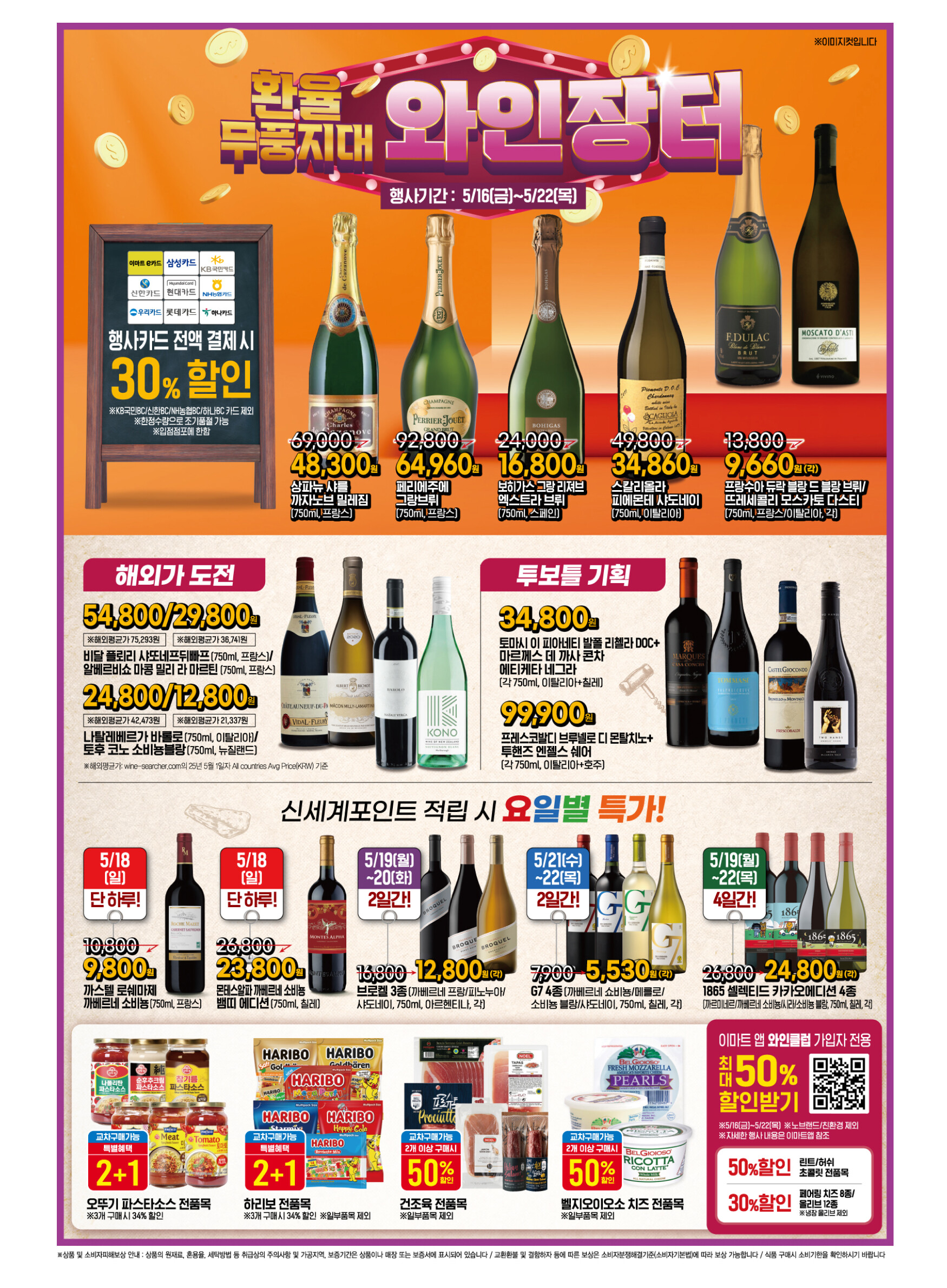이마트의 5월 셋째 주 행사는 와인부터 신선식품, 생활용품, 가전제품까지 다양한 카테고리에서 특별한 혜택을 제공합니다. 특히 제일제당 브랜드 페스타와 와인클럽 가입자를 위한 특별 할인은 놓치지 마세요. 행사카드로 결제하시면 더 많은 혜택을 받으실 수 있습니다. 이번 주도 이마트에서 알뜰하고 즐거운 쇼핑 되시길 바랍니다.