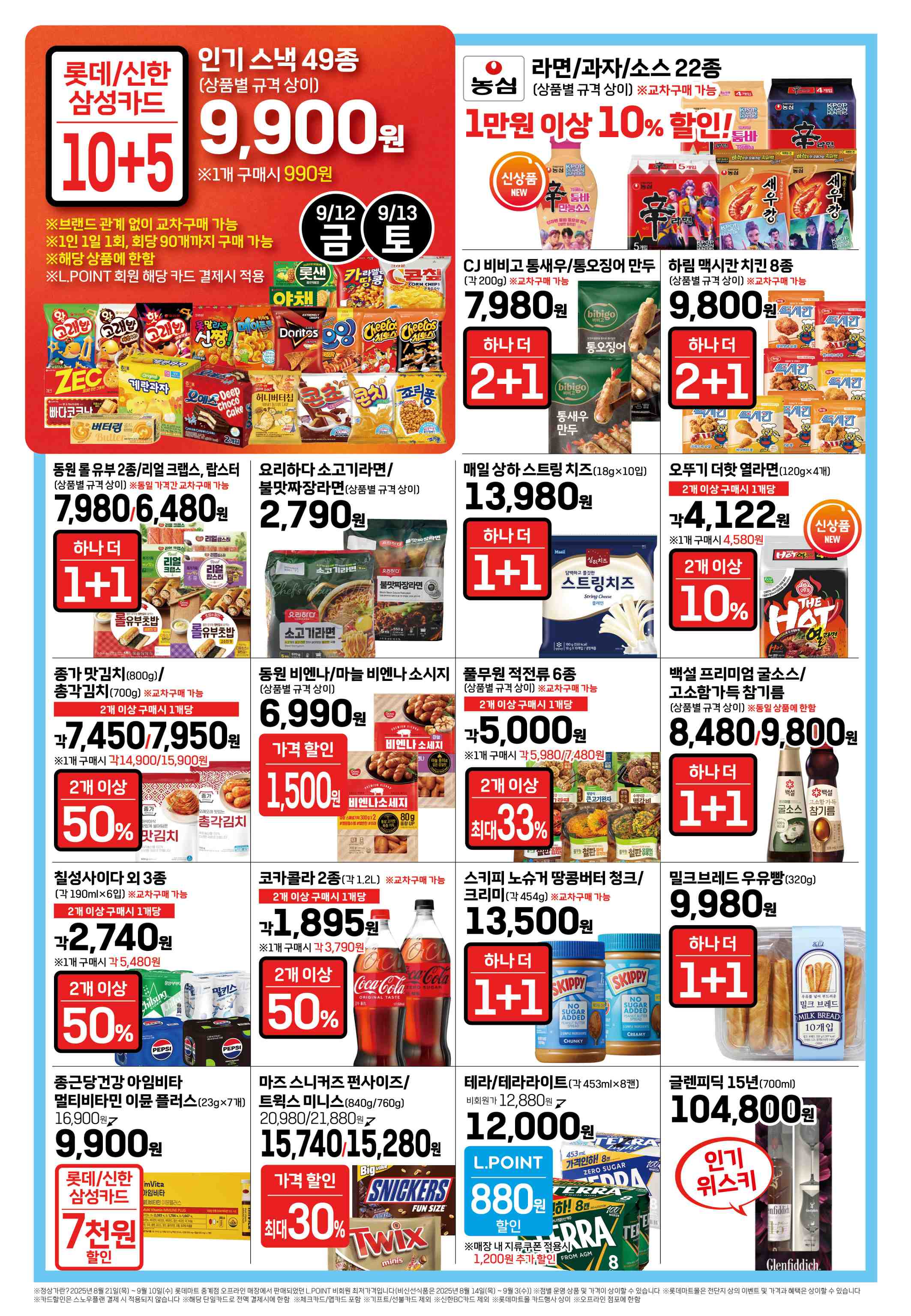 또한, 직진 가격 코너에서는 간편하게 즐길 수 있는 밀키트와 냉동식품, 주류 등을 파격적인 가격으로 선보이고 있습니다. 주말인 9월 12일(금)부터 13일(토)까지는 롯데/신한/삼성카드로 결제 시 추가 할인이 적용되는 상품들이 많으니, 해당 카드를 소지하고 있다면 더욱 알뜰한 쇼핑이 가능합니다.