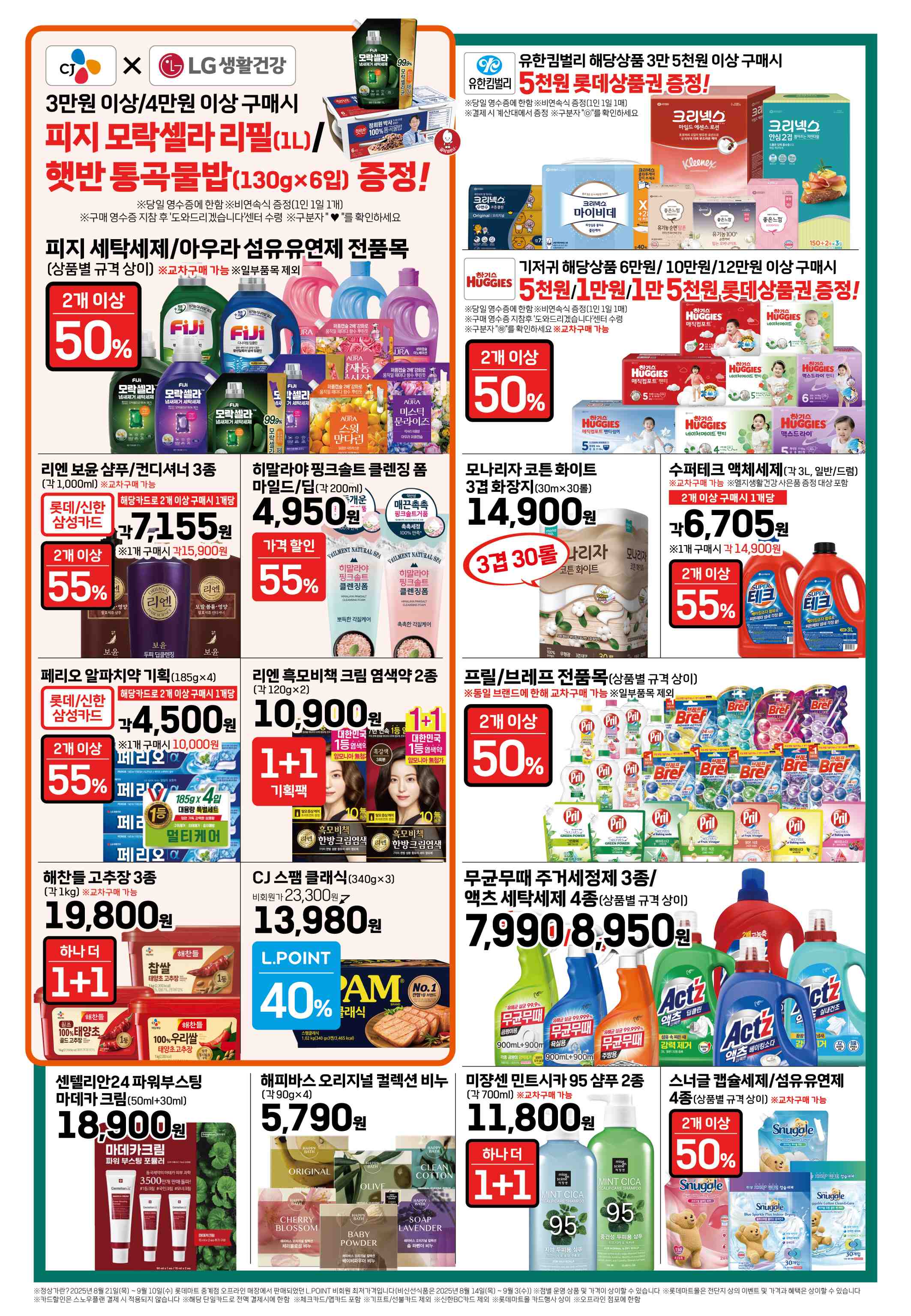 - 피지 모락셀라 리필, 리엔, 히말라야 핑코솔트, 페리오 알피치약, 리엔 흑모비책 크림 염색약, 프릴/브레프, 수퍼테크 액체세제, 무균무때 주거세정제/액츠 세탁세제, 해피바스 오리지널 컬렉션 비누, 미쟝센 민트시카 95 샴푸 2종, 스너글 캡슐세제/섬유유연제