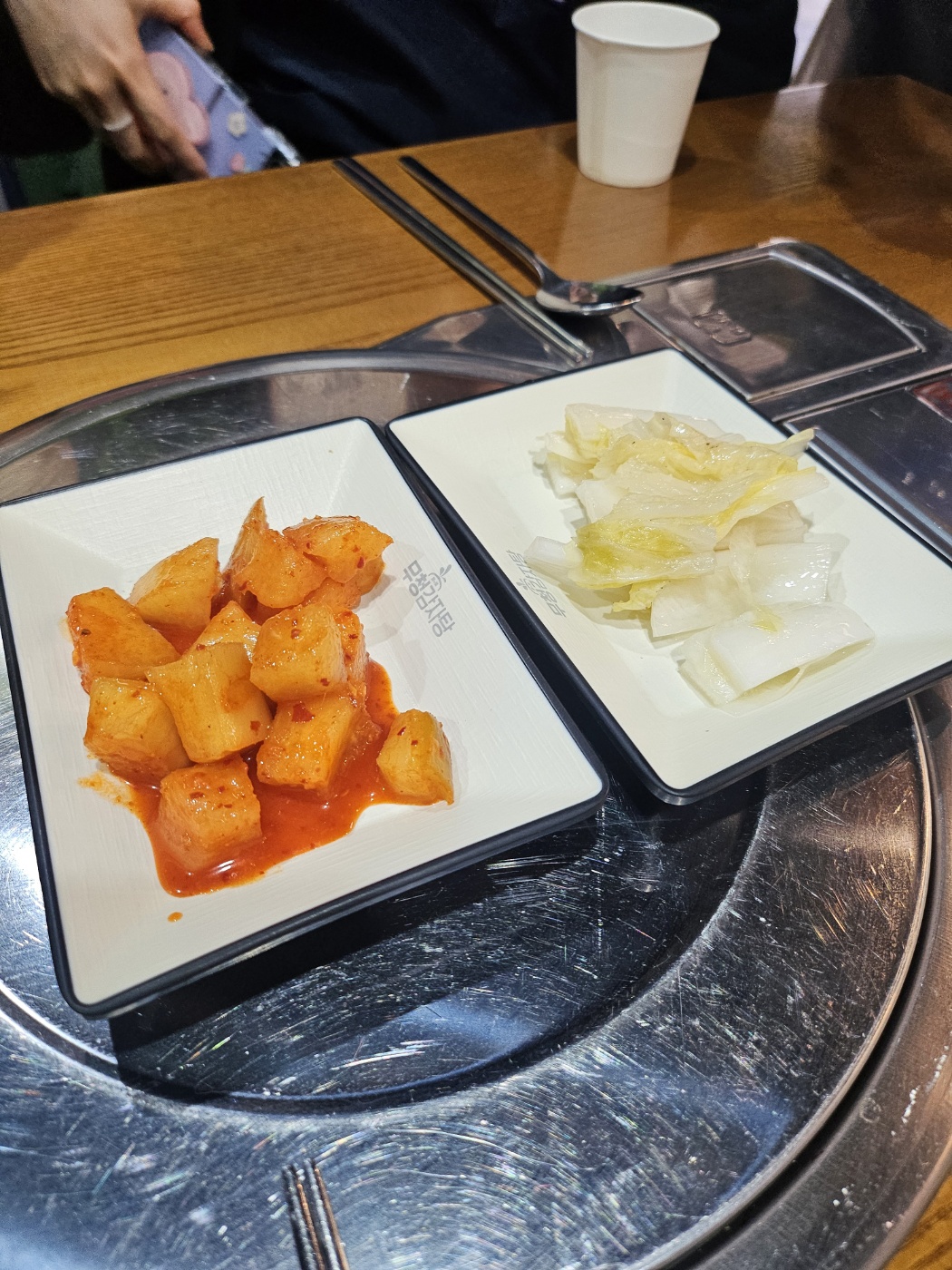 무청 감자탕 마포점에서 제공되는 반찬 중 깍두기와 백김치는 특히 맛있습니다. 깍두기는 적당히 익어 아삭한 식감이 일품이며, 백김치는 시원하고 깔끔한 맛이 특징입니다. 두 반찬 모두 시래기 뼈해장국과 잘 어울려 식사의 만족도를 높여줍니다.