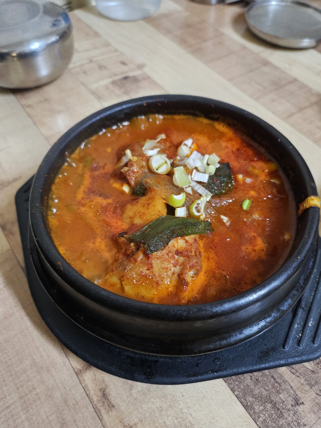 닭볶음탕은 식당의 핵심 메뉴로, 부드러운 닭고기와 풍부한 양념이 어우러져 매콤한 맛을 자랑합니다. 닭볶음탕은 식사 중간에 제공되며, 다양한 양념과 채소가 함께 제공되어 맛을 더해줍니다.