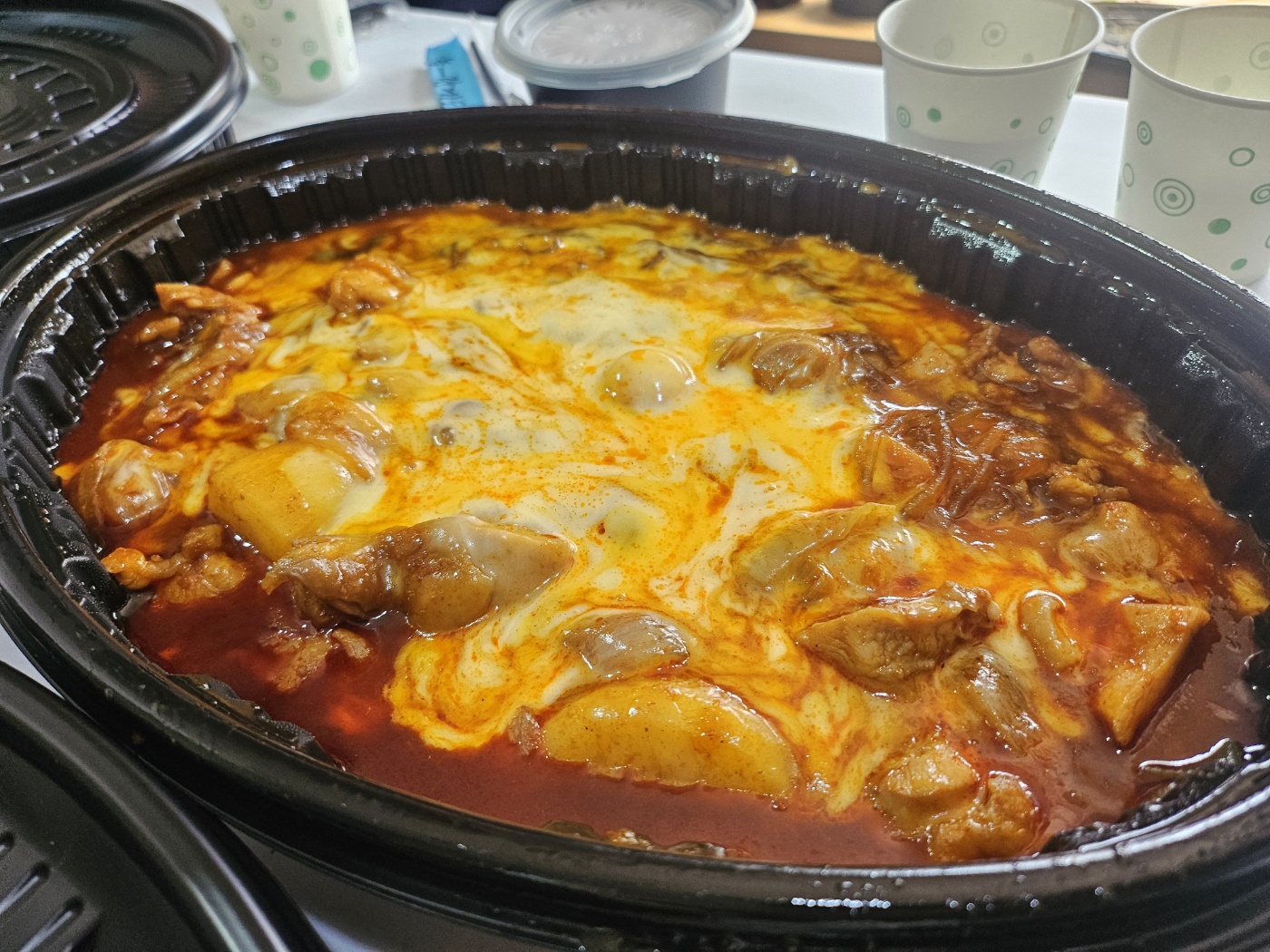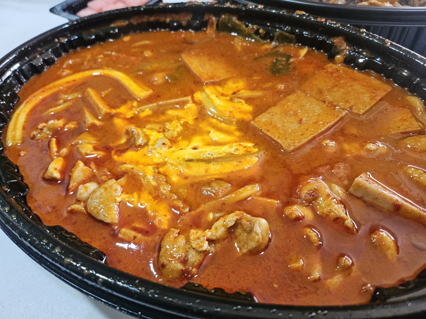 스팸부대찜닭은 CJ와의 콜라보로 탄생한 메뉴로, 스팸과 다양한 부대찌개 재료들이 어우러져 독특한 맛을 자랑합니다. 치즈, 스팸, 소시지, 떡, 우동 사리 등이 들어가 있어 풍부한 식감을 제공합니다. 매콤한 맛이 특징이며, 스팸 애호가들에게 특히 추천할 만한 메뉴입니다. 다만, 부대찌개 맛을 기대했다면 약간 실망할 수도 있습니다.