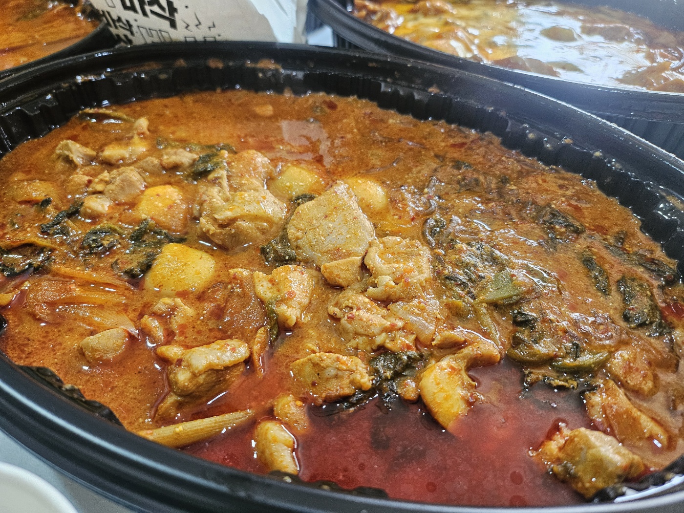 시래기찜닭은 부드러운 시래기와 진한 사골 육수가 어우러져 깊은 맛을 자랑하는 메뉴입니다. 시래기와 당면, 고구마, 감자, 양파 등 다양한 재료들이 들어가 있어 풍부한 맛을 제공합니다. 다만, 시래기가 다소 질길 수 있어 부드러운 시래기를 선호하는 분들에게는 추천하지 않습니다.