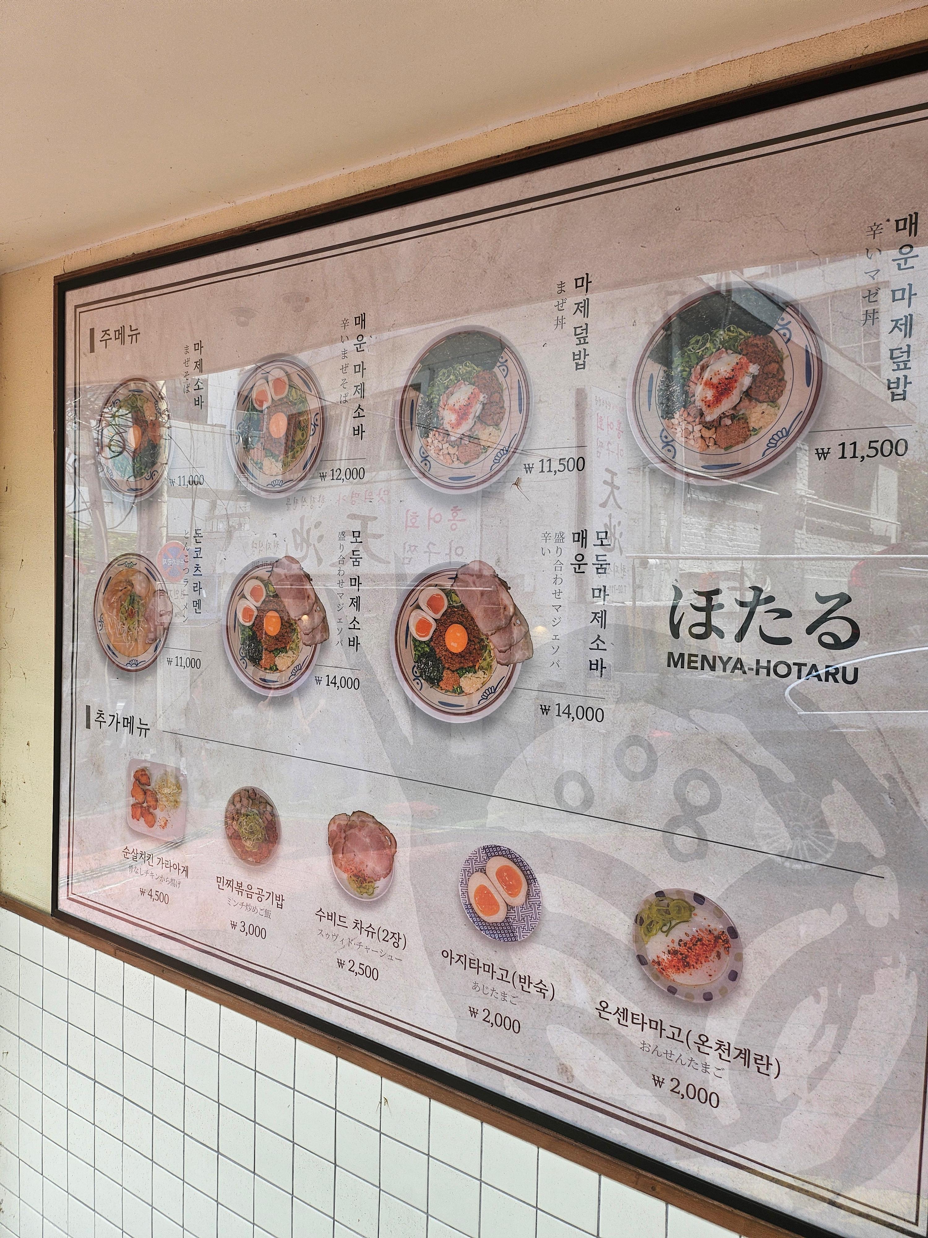 메뉴는 크게 돈코츠라멘과 마제소바 두 가지로 나뉩니다. 저는 고민 끝에 대표 메뉴 두 가지를 모두 맛보기로 결정했습니다. 돈코츠라멘은 뽀얗고 진한 육수가 인상적이었고, 차슈와 함께 푸짐하게 담겨 나와 보는 즐거움까지 더해주었습니다. 마제소바는 비빔 라멘의 일종으로, 면 위에 고기, 채소, 수란 등이 올라가 있어 알록달록한 비주얼이 시선을 사로잡았습니다. 특히, 멘야 호타루는 이 두 메뉴에 대한 확고한 철학을 가지고 있는 듯했어요. 각 메뉴에 대한 설명이 잘 되어 있어 메뉴판만 봐도 어떤 맛을 내는 곳인지 짐작할 수 있었습니다.