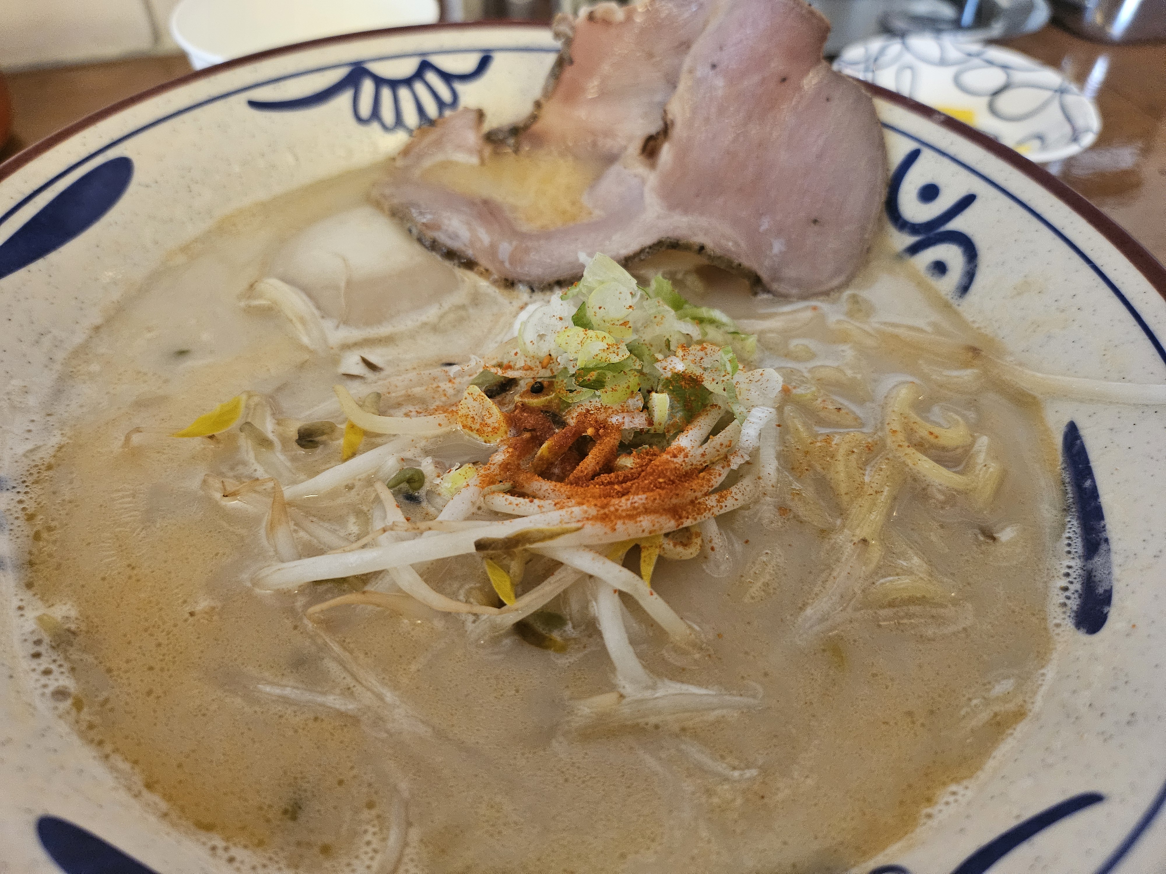 드디어 기다리던 돈코츠라멘이 나왔습니다. 한 숟가락 떠보니, 진하고 고소한 국물 맛이 일품이었습니다. 돼지뼈를 푹 고아낸 육수는 깊은 감칠맛을 내면서도 느끼하지 않았습니다. 면은 적당히 삶아져 쫄깃한 식감이 살아있었고, 함께 나온 부드러운 차슈는 입안에서 살살 녹았습니다. 저는 보통 라멘을 먹을 때 국물을 많이 남기는 편인데, 이곳의 국물은 정말 한 방울도 남기기 아까울 정도로 맛있었습니다. 한 그릇 뚝딱 비우고 나니 속이 든든해지는 기분이었어요.
