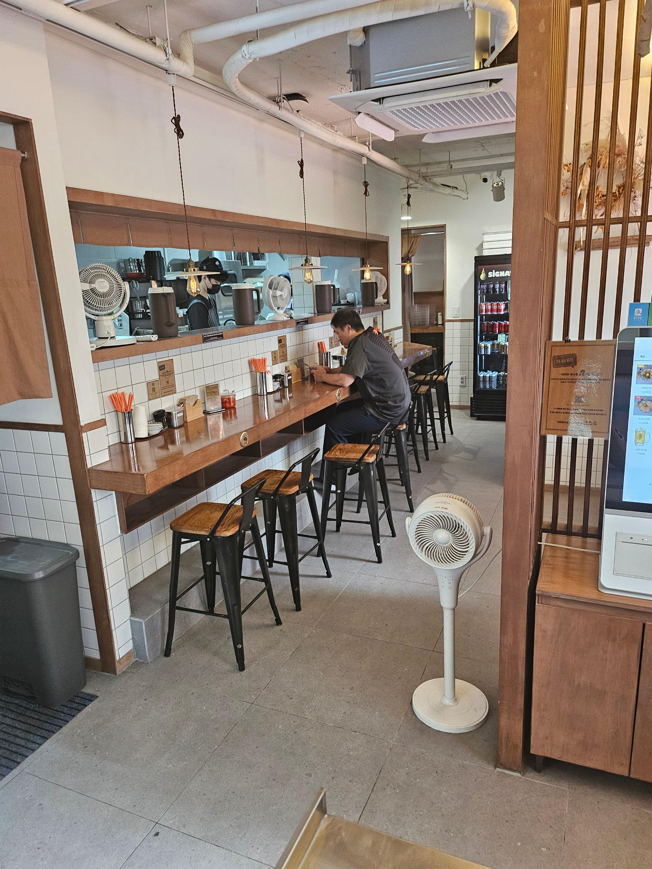 식당 내부는 전체적으로 아늑하고 깔끔한 분위기였습니다. 테이블은 많지 않고 대부분의 좌석이 바 형태로 되어 있어 혼밥하는 손님들도 부담 없이 식사할 수 있습니다. 저는 혼자 방문했기 때문에 오히려 바 좌석이 편하게 느껴졌습니다. 주방이 훤히 들여다보이는 구조라 조리 과정을 직접 볼 수 있다는 점도 좋았습니다. 위생에 대한 걱정 없이 안심하고 식사할 수 있는 환경이었죠. 전반적으로 깨끗하고 잘 정돈된 인테리어가 멘야 호타루의 신뢰도를 높여주었습니다.