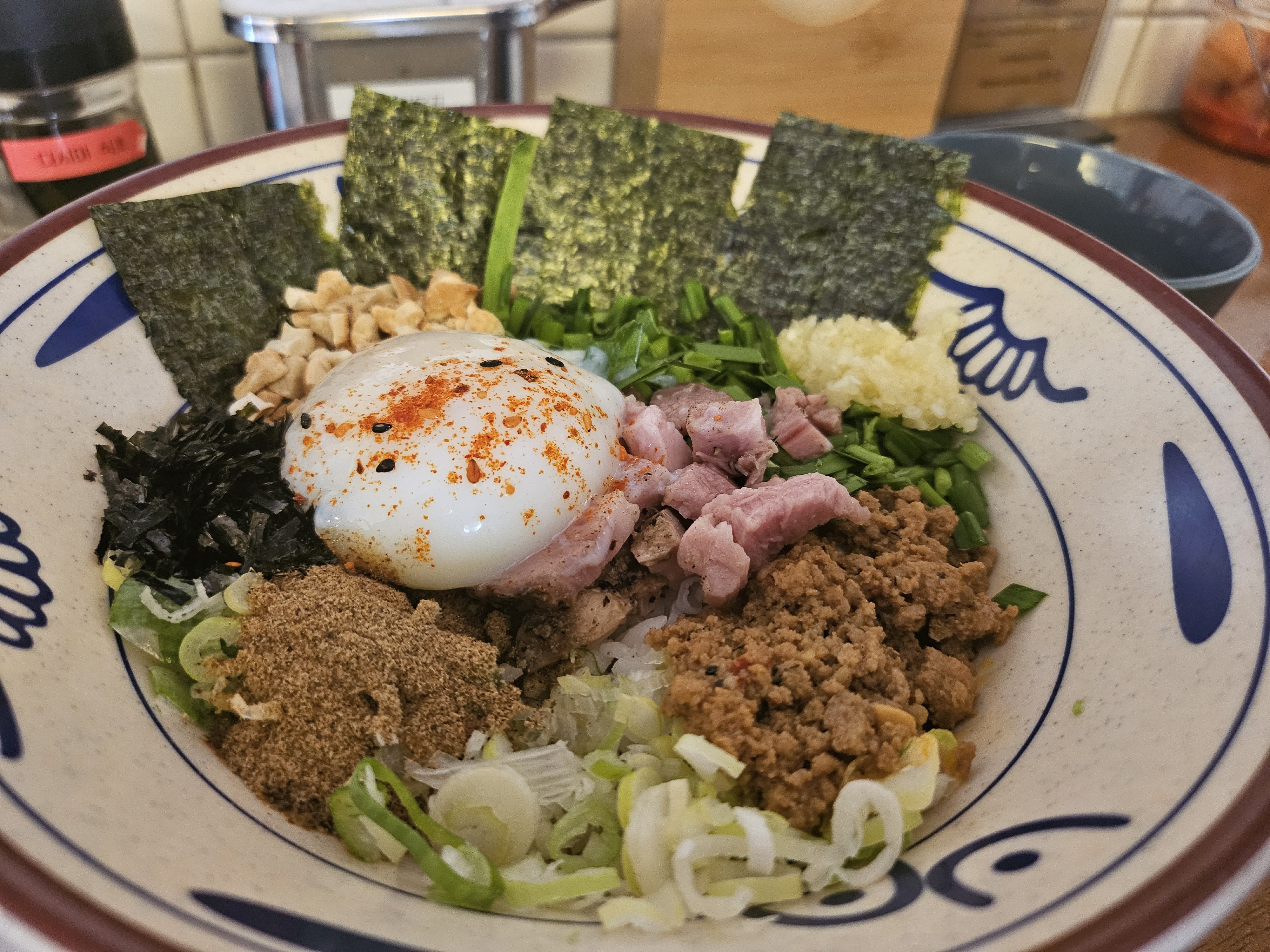 다음으로 마제소바를 맛보았습니다. 면과 재료들을 잘 섞어 한입 먹으니, 고소하면서도 새콤달콤한 맛이 입맛을 돋구었습니다. 특히, 면 위에 올라간 수란을 터뜨려 비벼 먹으니 훨씬 더 부드럽고 풍부한 맛을 느낄 수 있었습니다. 마제소바는 돈코츠라멘과는 또 다른 매력이 있었습니다. 쫄깃한 면발과 아삭한 채소의 조화로운 식감도 좋았고, 고기와 소스가 잘 어우러져 질리지 않고 계속 먹을 수 있었습니다. '다시마 식초'를 넣어 먹어보니, 예상대로 느끼함은 싹 사라지고 깔끔하고 개운한 맛이 더해져 더욱 맛있게 즐길 수 있었습니다.