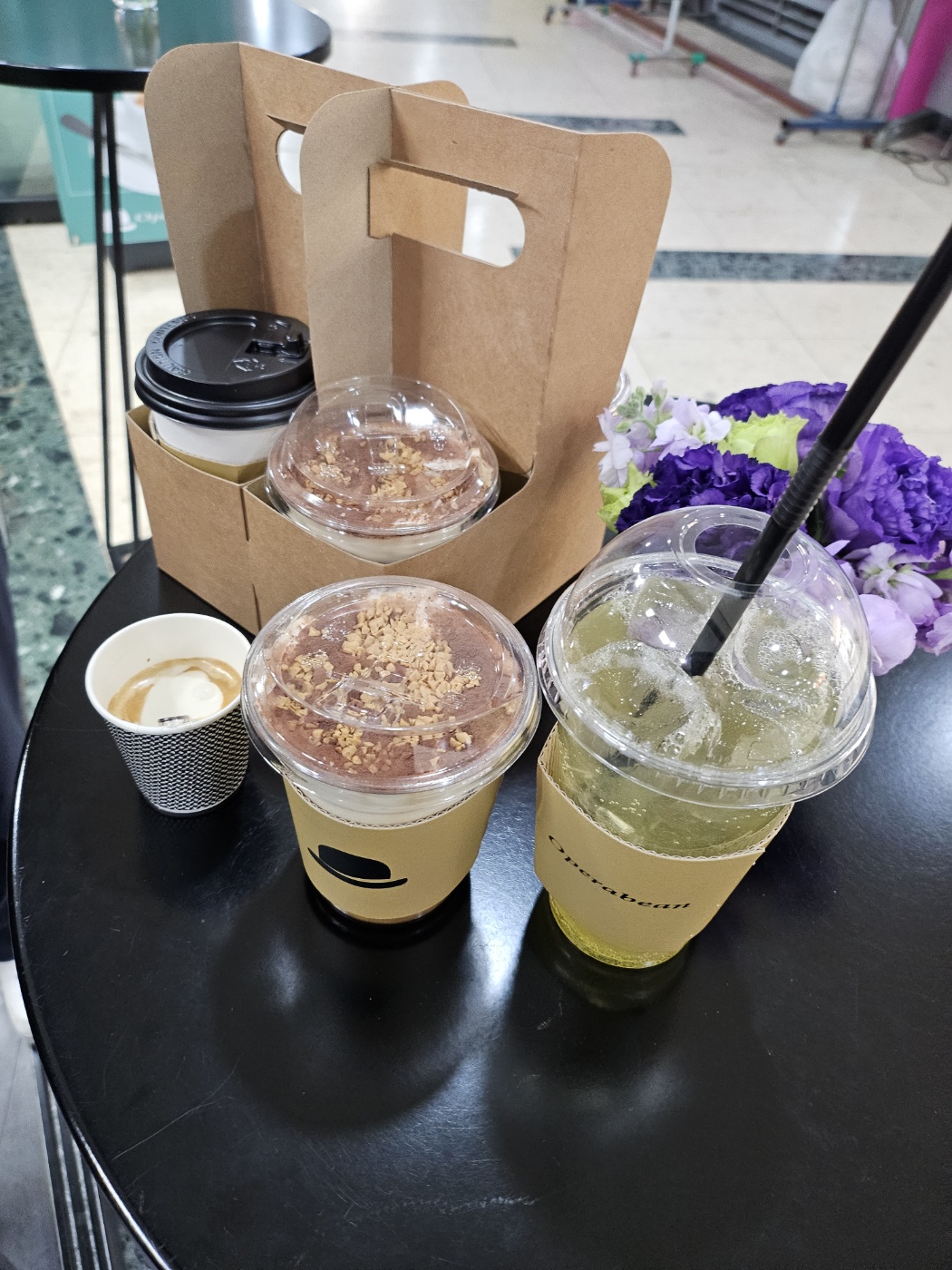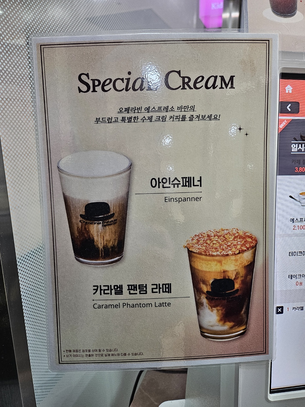 실제로 마셔본 카라멜 팬텀 라떼는 기대 이상이었다. 첫 입에서는 부드러운 카라멜의 달콤함이 느껴지다가, 중간에 에스프레소의 진한 향 이 퍼지며 마무리는 핑크 솔트의 은은한 짠맛 으로 끝난다. 생크림이 라떼와 완벽하게 어우러져 목넘김이 매우 부드럽다. 특히 라떼 아트로 그려진 팬텀 로고가 시각적 재미를 더해 사진으로 남기기에도 좋았다. 커피와 디저트가 조화를 이뤄 한 번에 경험하기에 충분한 메뉴다.