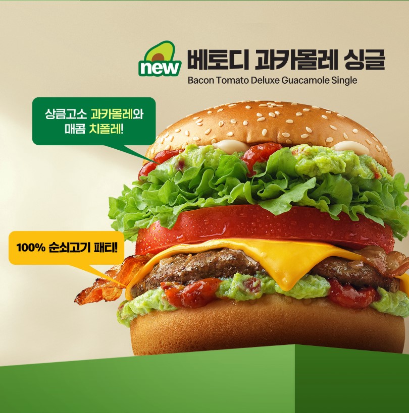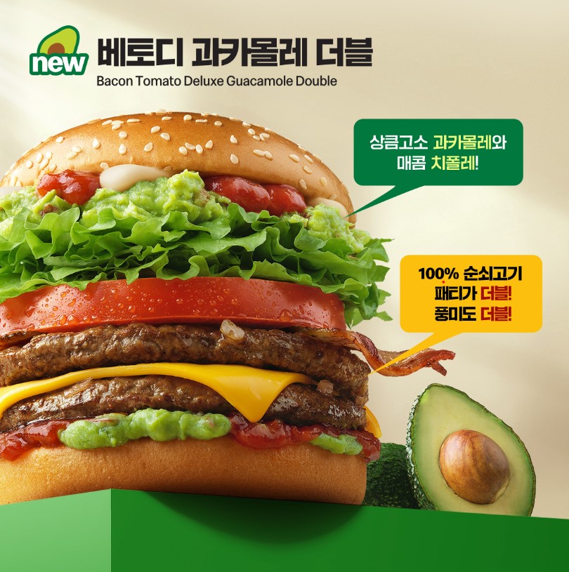 2025년 4월 30일, 맥도날드가 새로운 신메뉴 ‘베토디 과카몰레 더블’과 ‘베토디 과카몰레 싱글’을 전격 출시했습니다. 이번 신제품은 맥도날드의 스테디셀러 ‘베이컨 토마토 디럭스(베토디)’에 신선한 아보카도 과카몰레와 매콤한 치폴레 소스를 더해 이국적이면서도 신선한 풍미를 강조한 것이 특징입니다. 더블 메뉴는 100% 순쇠고기 패티 두 장으로 진한 육즙을, 싱글은 패티 한 장으로 담백함을 살렸습니다. 두 제품 모두 점심 한정 ‘맥런치’ 세트로도 만나볼 수 있어 가성비까지 챙길 수 있습니다.