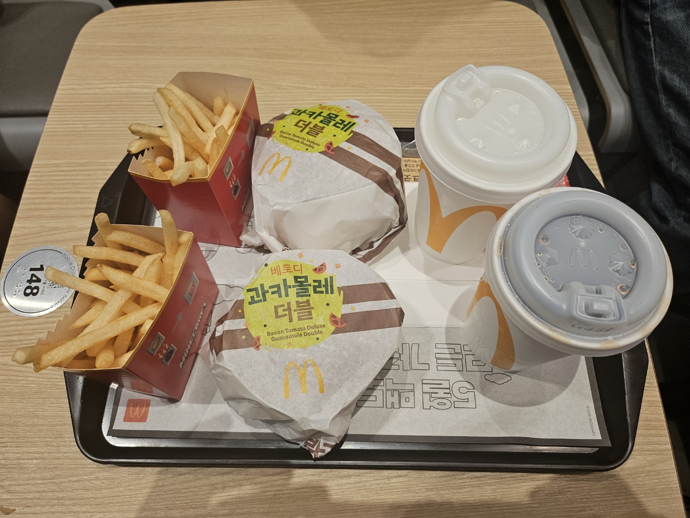 매장 방문 후 맥런치 시간(오전 10시 30분~오후 2시)에 맞춰 베토디 과카몰레 더블버거 맥런치세트를 주문했습니다. 받아보니 버거의 크기가 확실히 묵직하고, 두툼한 순쇠고기 패티 두 장이 존재감을 뽐냅니다. 신선한 양상추와 토마토, 그리고 초록빛 과카몰레가 듬뿍 들어가 있어 비주얼부터 기대감을 높여줍니다.