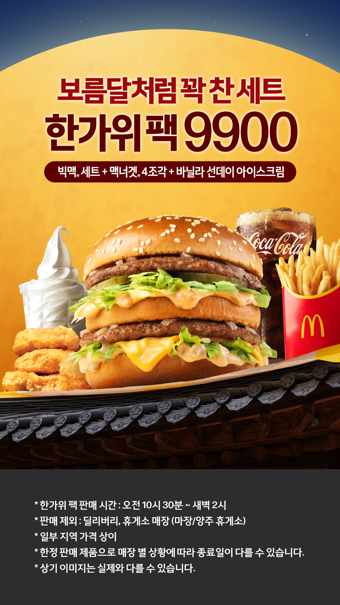 이번 '한가위 팩'은 빅맥 세트, 맥너겟 4조각, 바닐라 선데이 아이스크림 등 총 5종의 인기 메뉴로 구성되어 있습니다. 식사와 후식을 모두 즐길 수 있어, 가족 모두가 만족할 수 있는 훌륭한 선택이 될 것입니다.