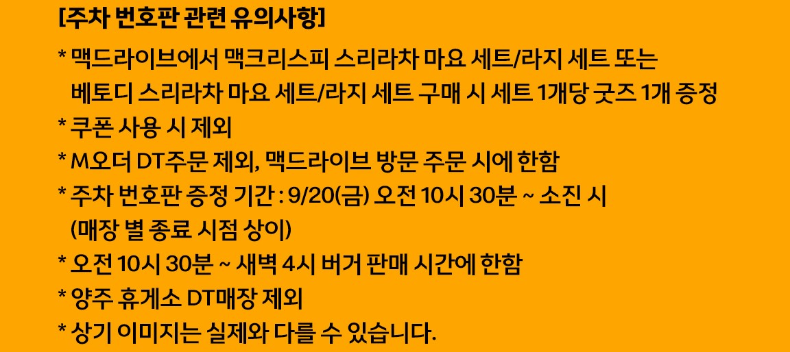 - 참여 방법: 맥드라이브를 통해 스리라차 마요 세트를 구매하면 주차 번호판을 무료로 증정.