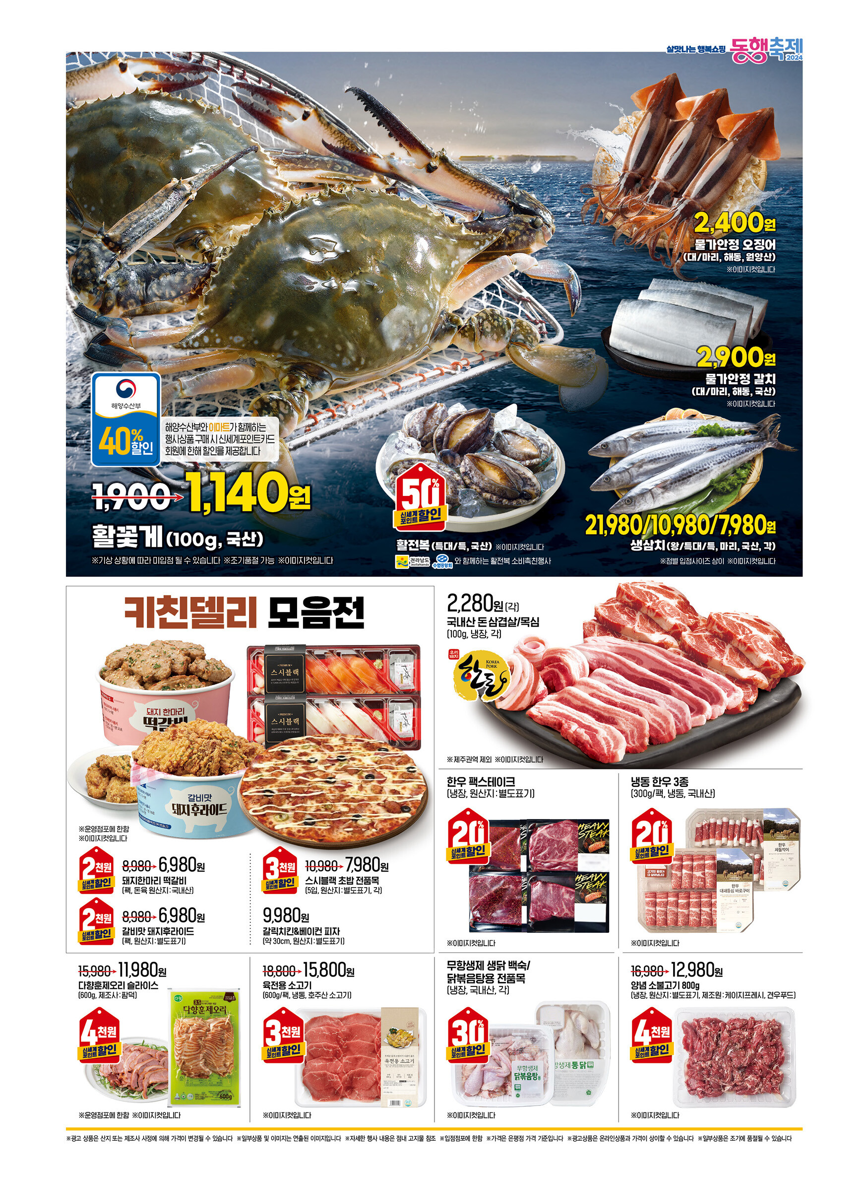 - 활 꽃게: 100g당 1,140원 (40% 할인)