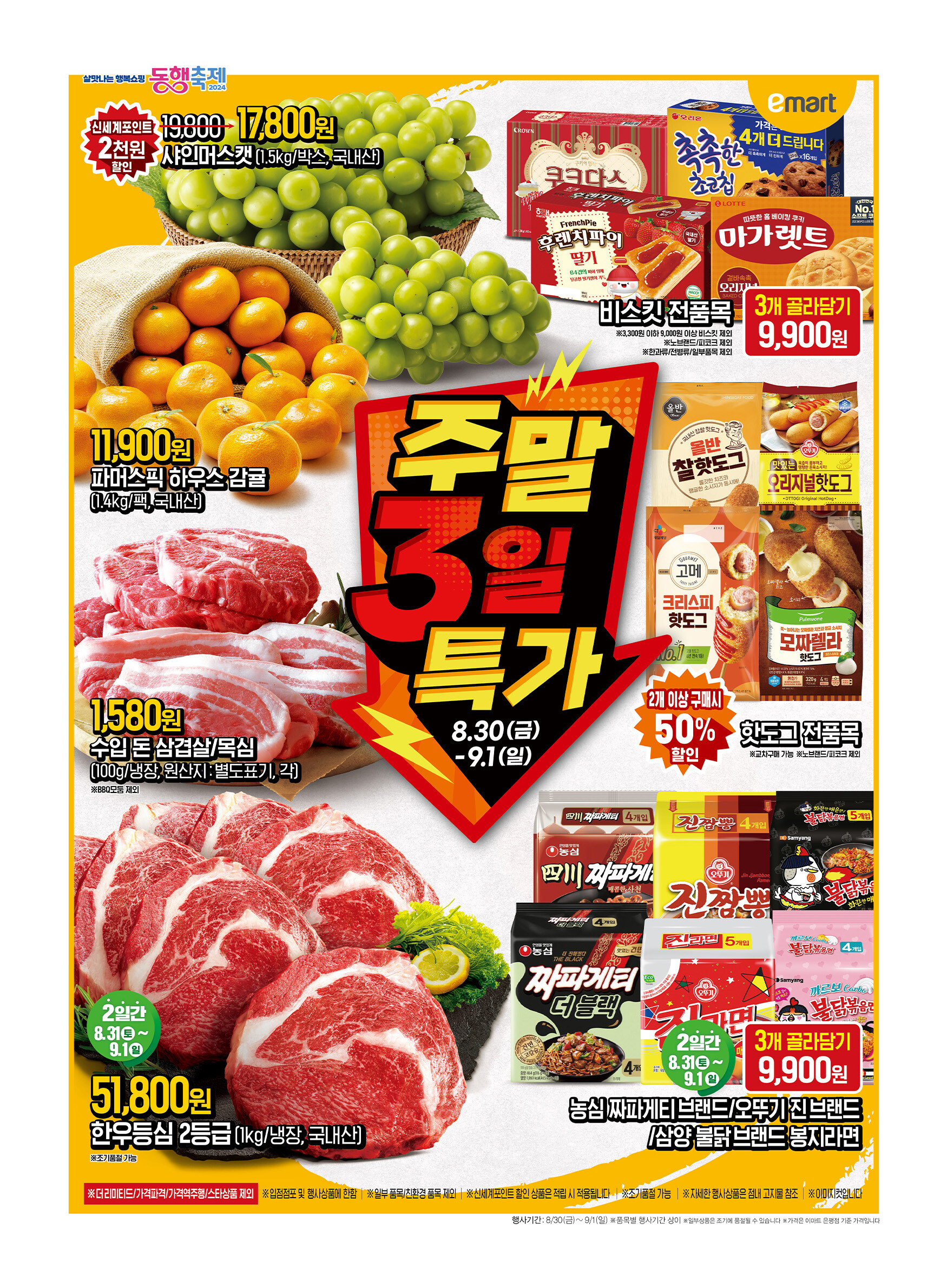 이마트에서는 이번 주말 3일간 특별한 할인 행사를 진행합니다. 금요일부터 일요일(9월 1일)까지 다양한 상품을 특가로 만나보세요.