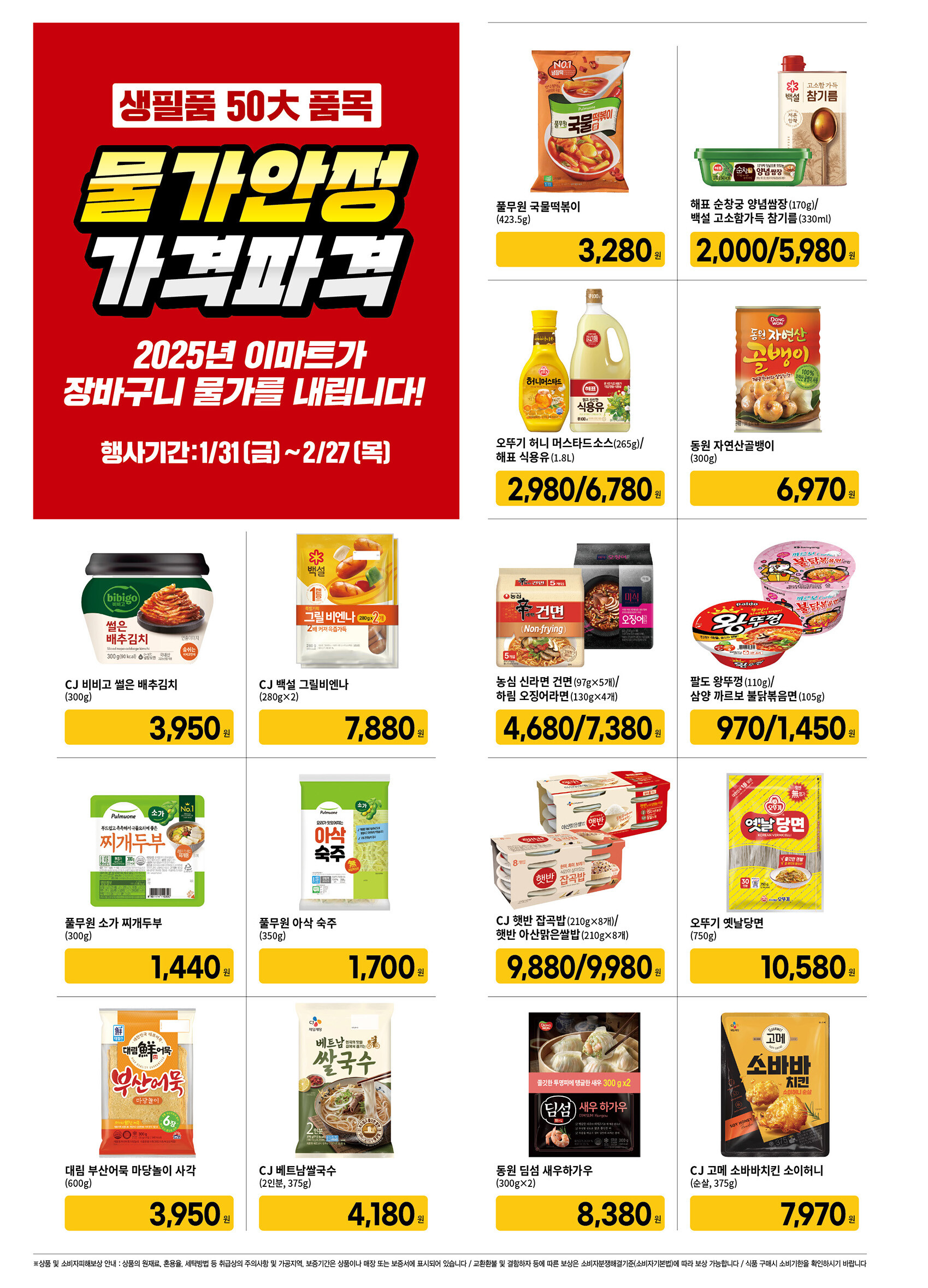 - 2월 한 달 동안 진행되는 물가안정 가격파격 상품도 놓치지 마세요! 다양한 생활용품과 신선식품을 저렴한 가격에 구입할 수 있는 기회입니다.