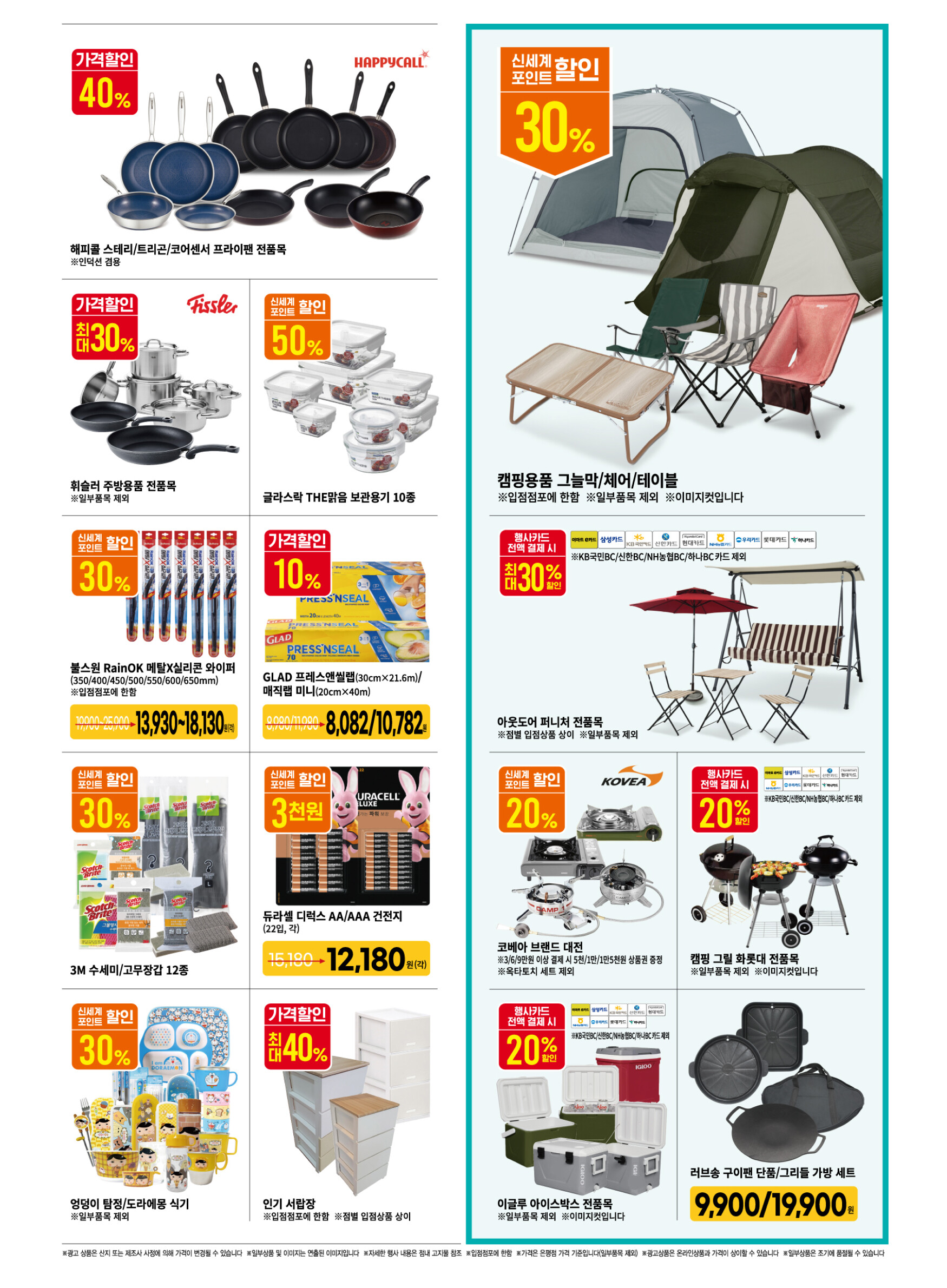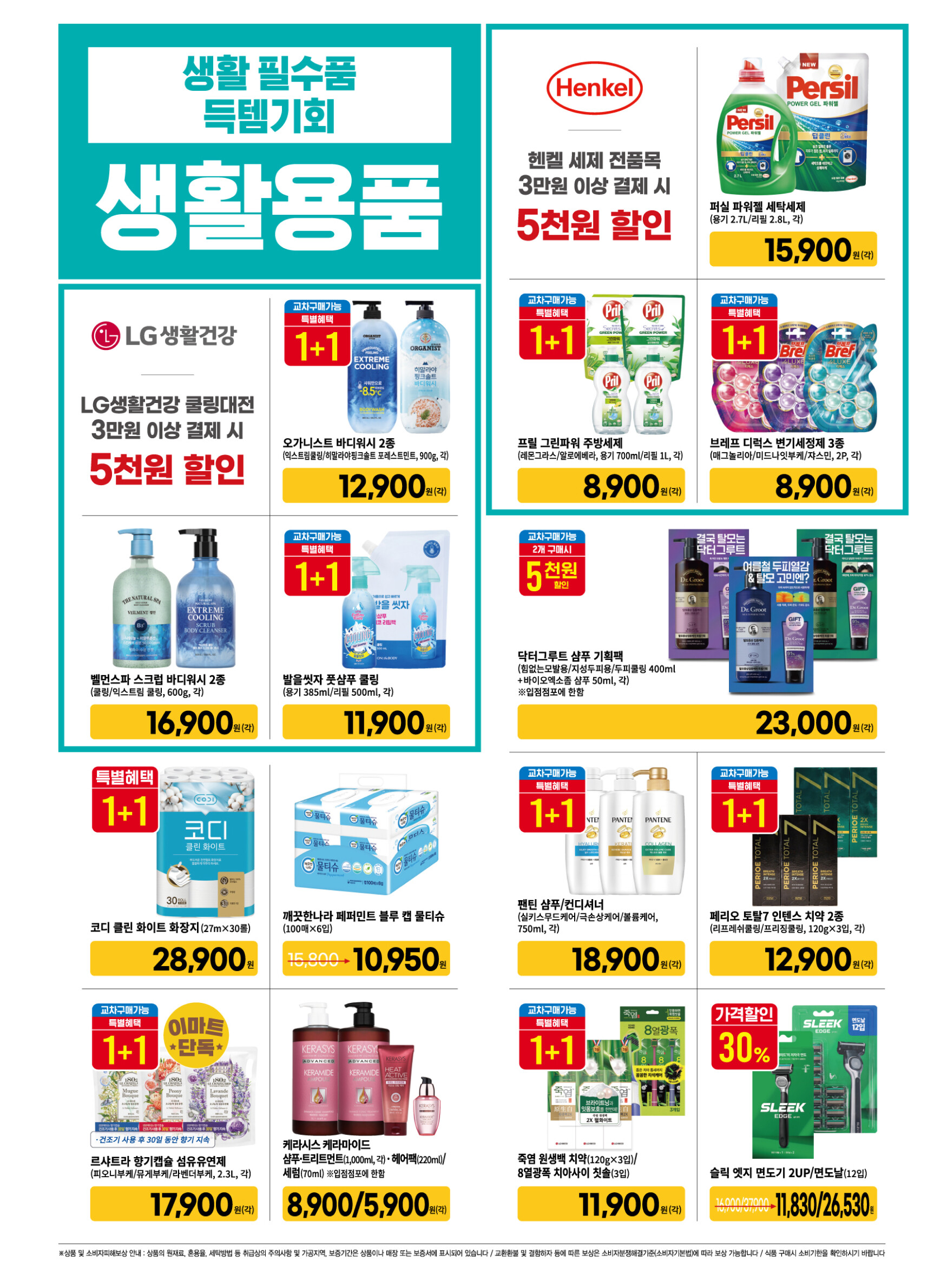 - 헨켈 세제 전품목 : 3만원 이상 결제 시 5천원 할인 (퍼실 파워젤 세탁세제 각 15,900원, 프릴 그린파워 주방세제, 브레프 디럭스 변기세정제 3종 1+1)