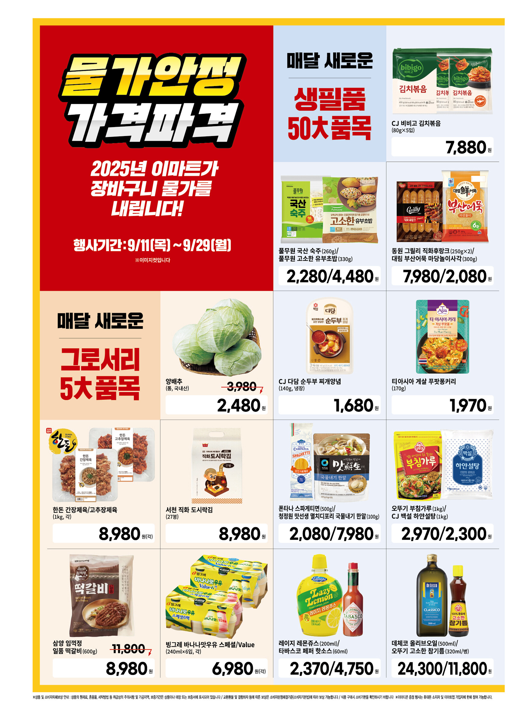특히, 이마트는 물가안정 가격파격 행사를 9월 29일까지 진행하며 양배추, 한돈 제육, 도시락김 등 5대 그로서리 품목과 50대 생필품을 초특가에 제공합니다.