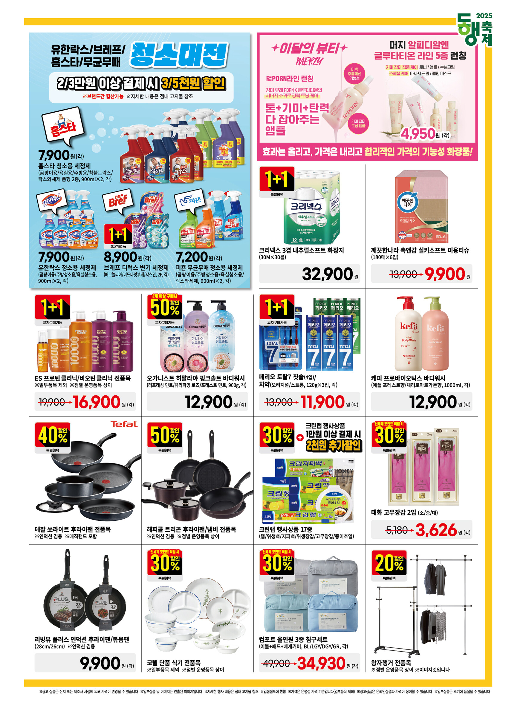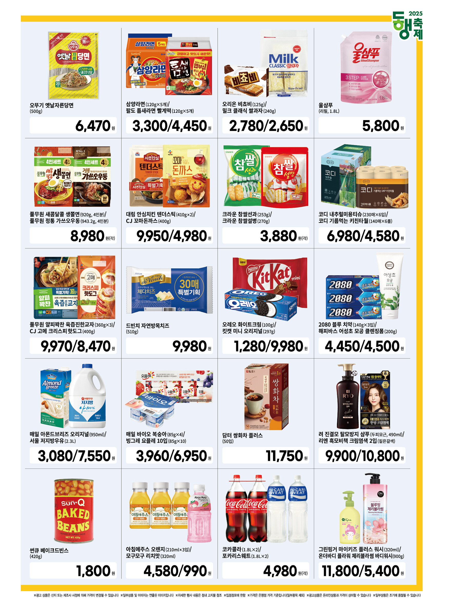 - CJ 비비고 김치볶음, 풀무원 국산숙주/고소한 유부초밥, 동원 그릴리 직화 후랑크/대림 부산어묵 마당놀이사각, CJ다담 순두부 찌개양념, 티아시아 게살 푸팟퐁커리, 폰타나 스파게티면 500g, 청정원 맛선생 멸치디포리 국물내기 한알, 오뚜기 부침가루1kg/CJ 백설 하얀설탕1kg, 레이지 레몬주스 200ml, 타바스코 페퍼 핫소스60ml, 데체코 올리브오일 500ml, 오뚜기 고소한 참기름 320ml, 오뚜기 옛날자른당면, 말도 틈새라면 빨계떡, 밀크 클래식 쌀과자(240g), 울샴푸, 풀무원 새콤달콜 생쫄면/정통 가쓰오우동, 대림 안심치킨 텐더스틱/꼬마돈까스, 크라운 참쌀 선과/참쌀설병, 코디내추럴미용티슈/기름먹는 키친타월, 풀무원 얄피꽉찬 육즙진한교자/CJ 고메 크리스피 핫도그, 드빈치 자연방목치즈, 오레오 화이트크림/킷캣 미니 오리지널, 매일 아몬드브리즈 오리지널/서울 저지방우유 2.3L, 매일 바이오 복숭아/빙그레 요플레 10입, 2080 블루치약/해피바스 모공 클렌징폼, 려 진결모 탈모방지 샴푸/리엔 흑모비책 크림염색 2입, 아침에주스 오렌지/모구모구 리치맛, 코카콜라 1.8Lx2/포카리스웨트 1.8Lx2 4,980원, 그린핑거 마이키즈 플러스워시/온더바디 플라워 체리블라썸 바디워시