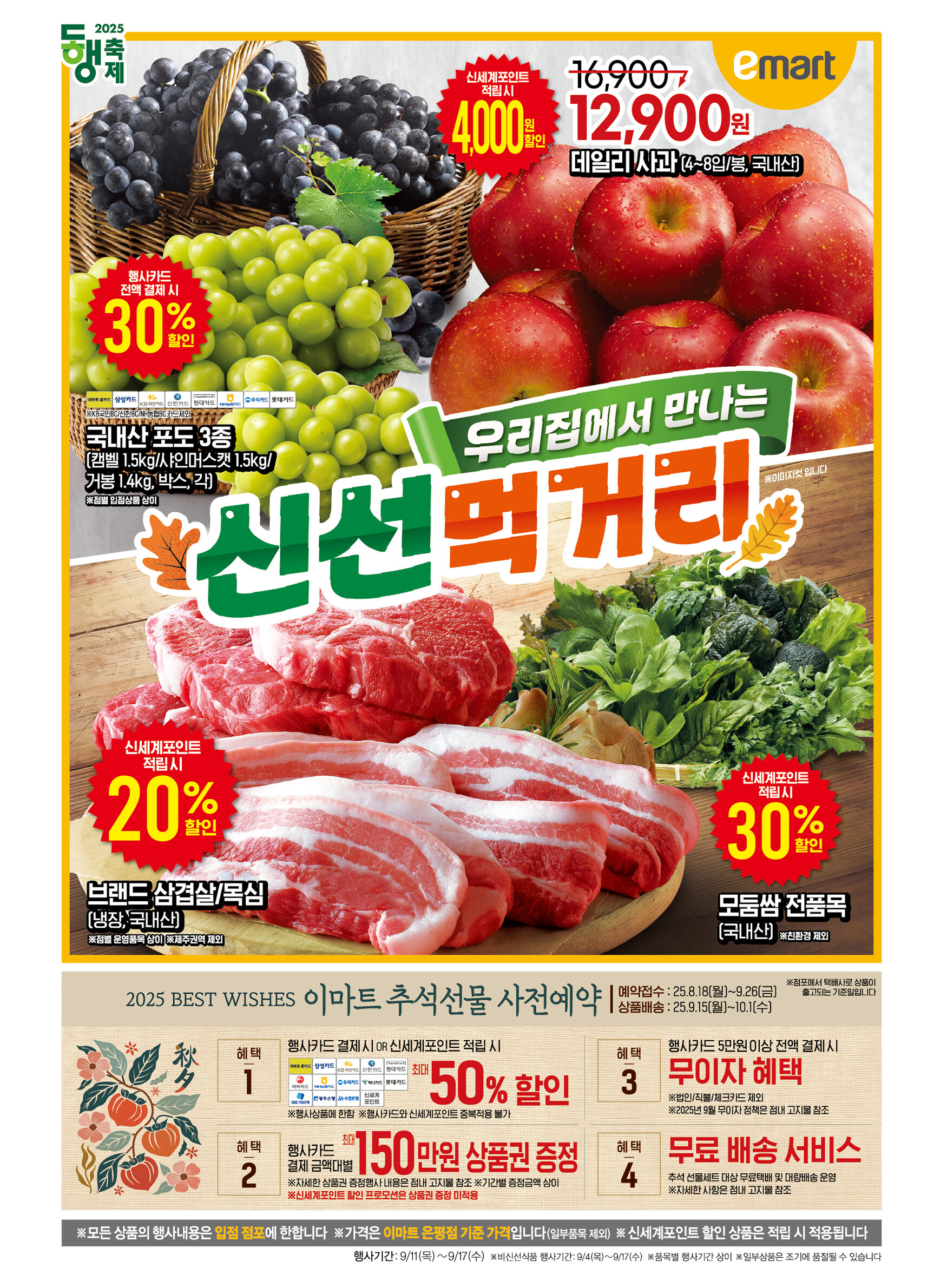 가을이 무르익어가는 9월, 이마트가 고객 여러분의 장바구니를 풍성하게 채워줄 다채로운 행사를 준비했습니다. 신선식품부터 가공식품, 생활용품까지 다양한 카테고리에서 역대급 할인 혜택을 제공합니다. 특히 추석을 앞두고 선물세트 사전 예약과 함께 다양한 특별 할인 행사가 진행되니, 이번 기회를 놓치지 마시고 알뜰한 쇼핑을 즐겨보세요.