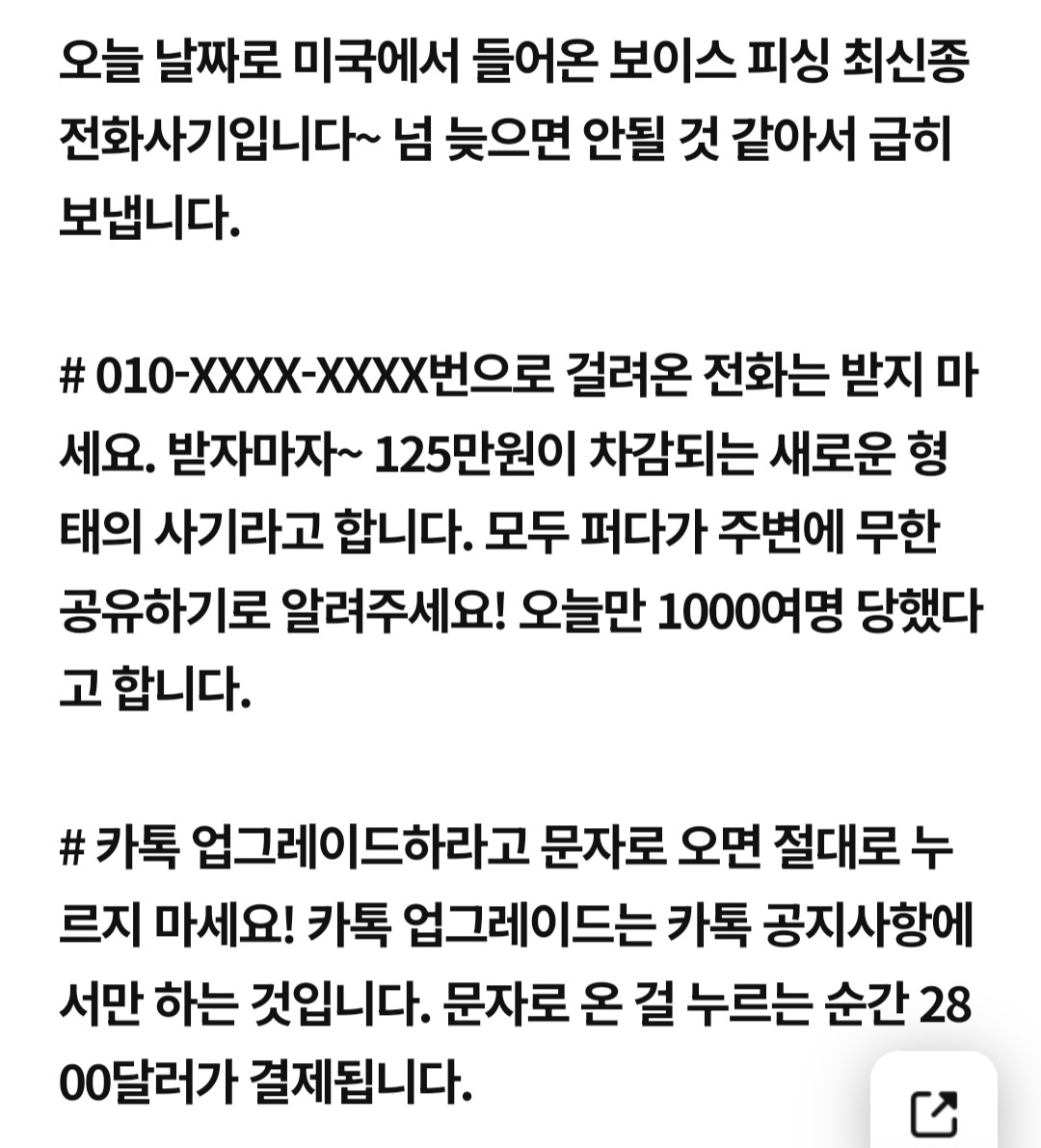 "전화받으면 125만원 결제"라는 허위 정보는 사실 2012년부터 유행했던 전화 수신 결제 사기 수법의 변형입니다. 당시에는 다른 결제 금액과 전화번호가 사용되었지만, 기본적인 사기 방식은 동일합니다. 이와 같은 허위 정보는 주로 불특정 다수에게 전송되며, 사람들의 불안감을 이용해 사기를 시도합니다.