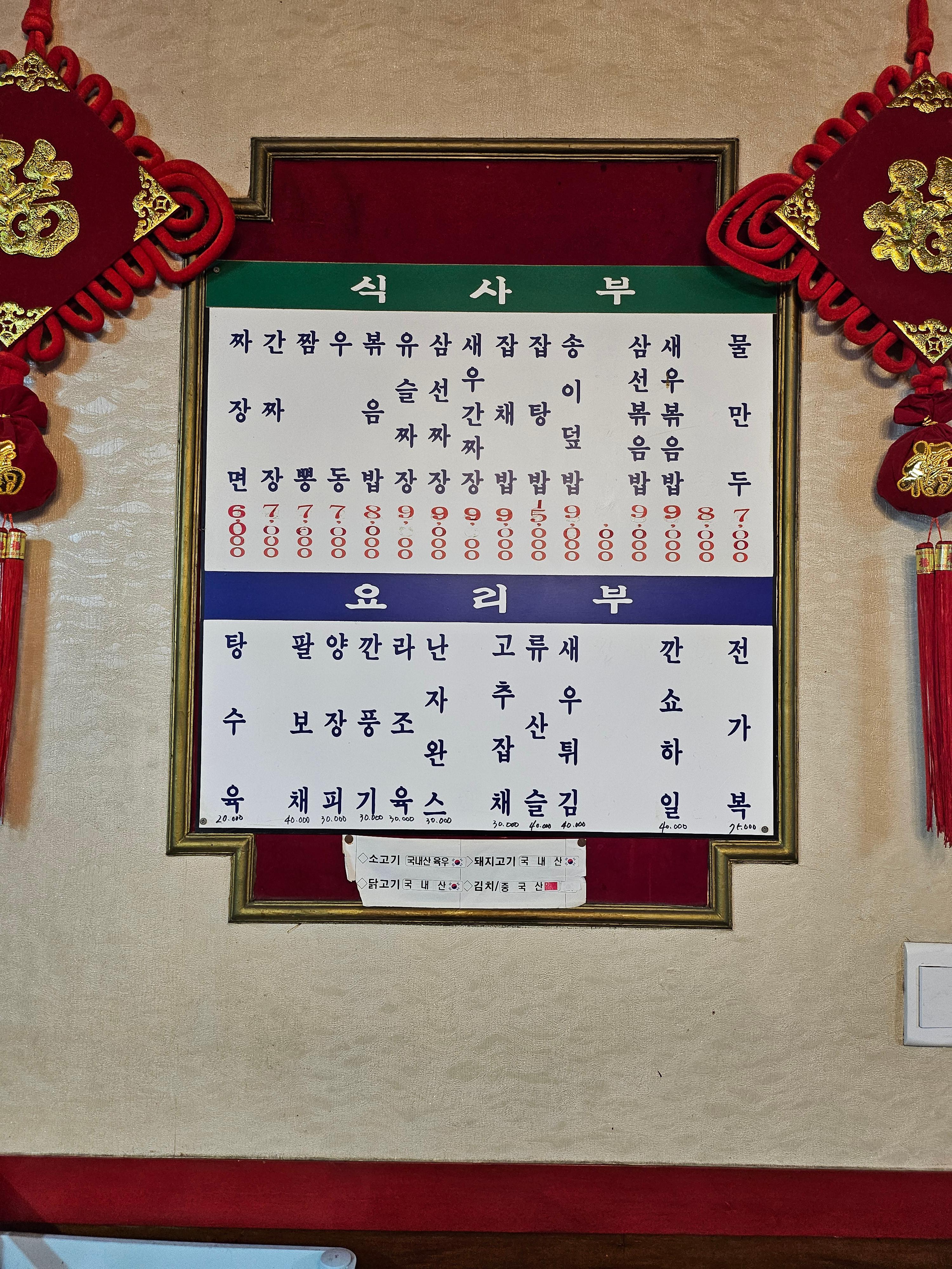 동해루의 메뉴는 짜장면, 짬뽕, 볶음밥 등 기본적인 식사류부터 잡채밥, 잡탕밥과 같은 덮밥류, 그리고 팔보채, 양장피, 깐풍기 등 다양한 요리류까지 폭넓게 제공됩니다. 특히 이곳에서는 독특하게 새우튀김도 판매하고 있어 눈길을 끕니다. 이날 저는 간짜장과 짬뽕을 주문했는데, 따뜻한 차가 물로 제공되며, 단무지와 간장은 1인 1개씩 제공되어 좋았습니다. 그 외 식초, 후추, 고춧가루는 테이블 위에 구비되어 있었습니다.