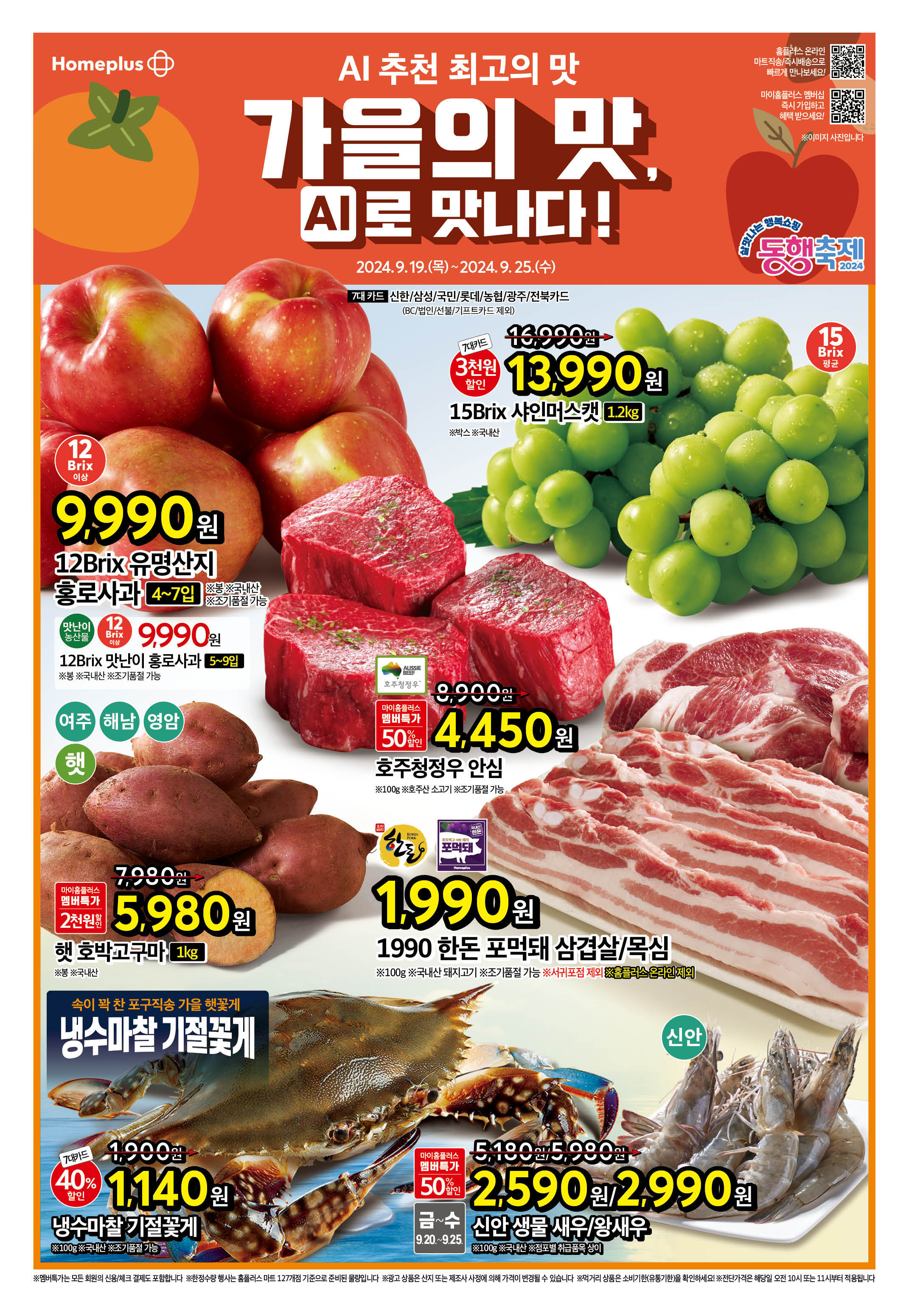 홈플러스가 9월 19일부터 25일까지 ‘가을의 맛 AI로 맛나다’ 행사를 통해 가을 먹거리를 최대 50% 할인된 가격에 선보입니다. 이번 행사는 AI를 활용한 고객 빅데이터 분석을 통해 가을 대표 먹거리를 엄선하여 합리적인 가격으로 제공합니다.