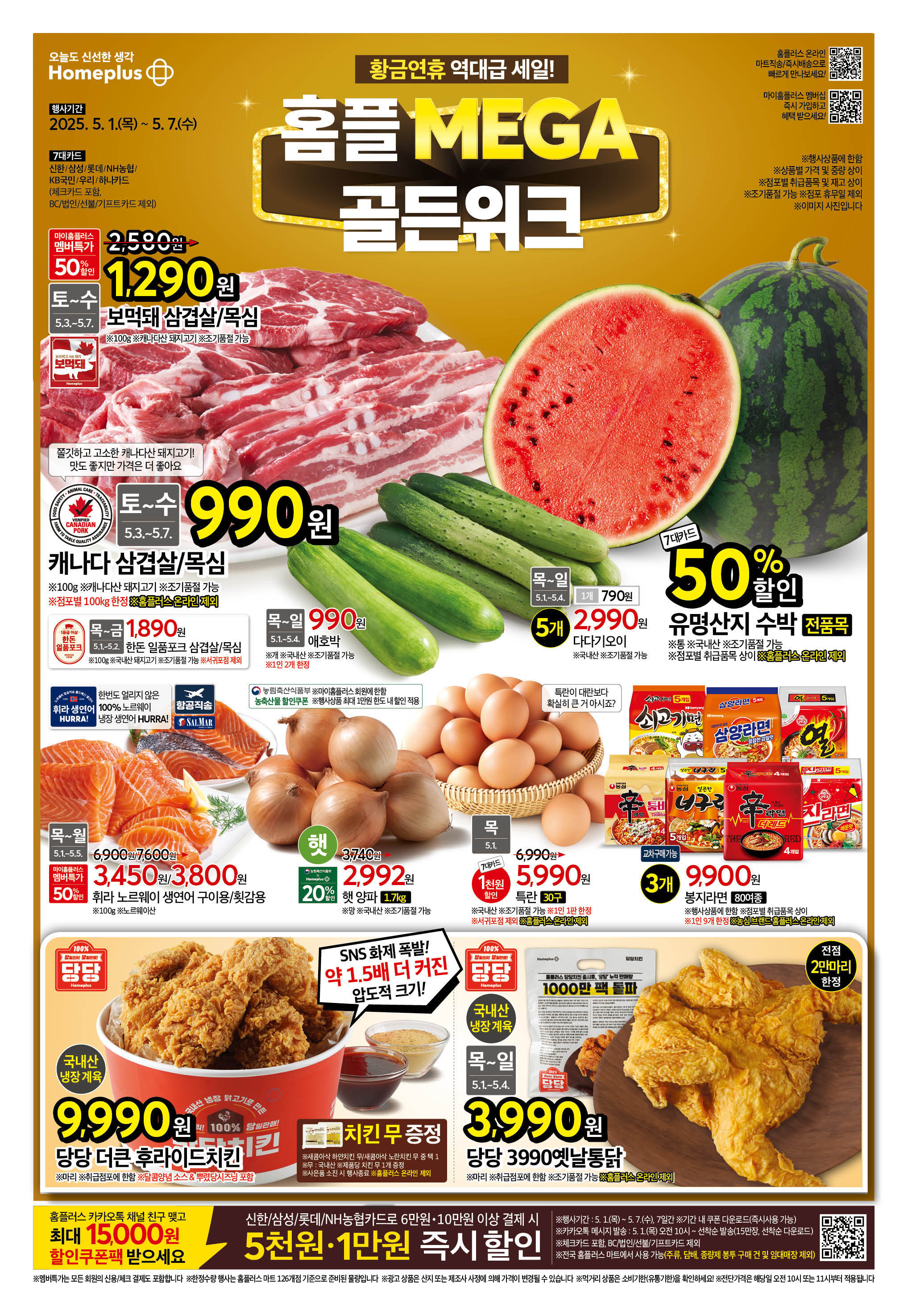 안녕하세요! 대한민국 유통 트렌드를 꿰뚫는 전문가입니다. 오늘은 홈플러스의 2025년 5월 1일부터 7일까지 진행되는 메가 골든위크 전단 행사를 상세히 소개해드립니다. 이번 행사는 신선식품부터 주류, 완구까지 다양한 카테고리에서 초특가 상품을 만나볼 수 있으며, 4대 카드(신한/삼성/롯데/농협) 결제 시 추가 혜택까지 제공됩니다. 특히 현금 흐름 개선을 위한 집중 할인 전략으로, 소비자들에게는 절호의 기회가 될 것입니다 24.