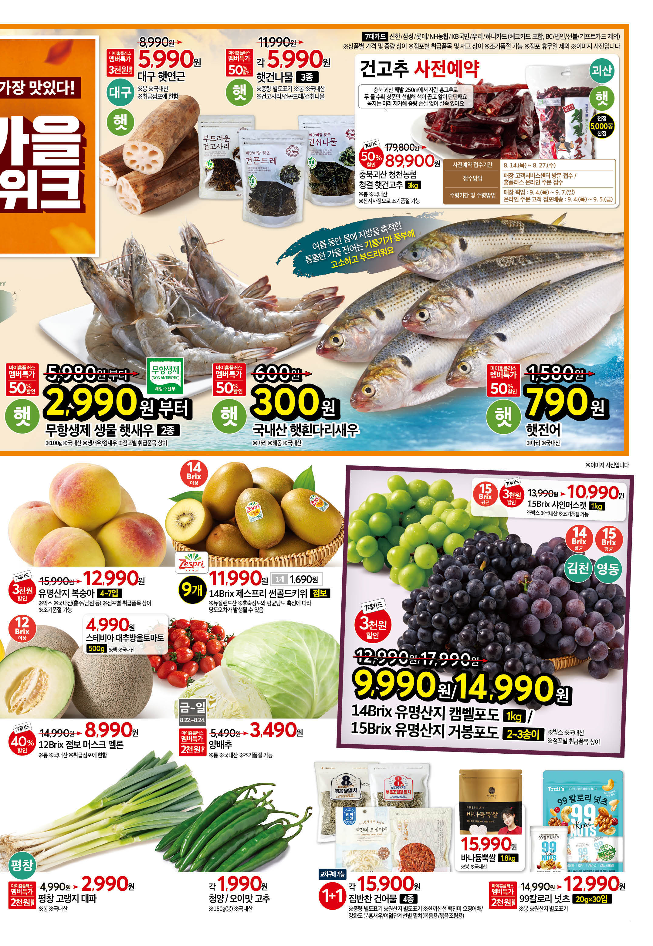 가을 제철 과일들이 신선하게 도착했어요. 사과나 배처럼 달콤한 과일로 디저트나 간식을 준비해보세요. 대부분 8월 21일부터 24일 또는 27일까지 진행되니, 주말에 방문하시면 더 많은 선택지가 있을 거예요.