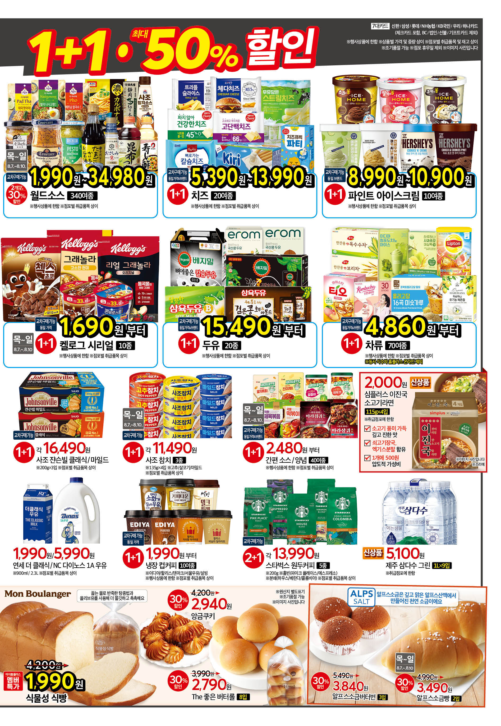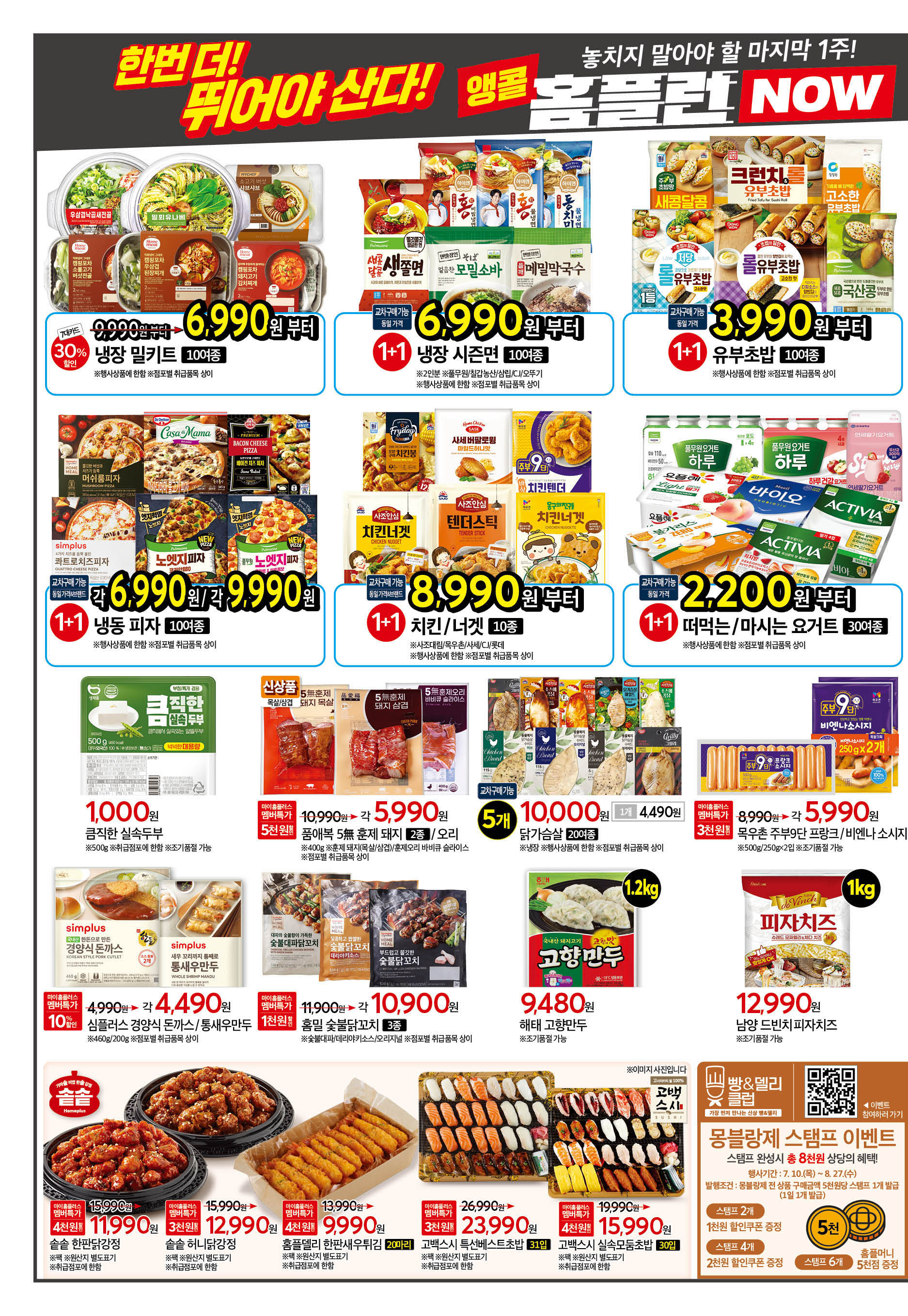 - 냉장 시즌면 10여종, 유부초밥 10여종, 냉동 피자 10여종, 치킨/너겟 10종, 떠먹는/마시는 요거트 30여종: 1+1 행사