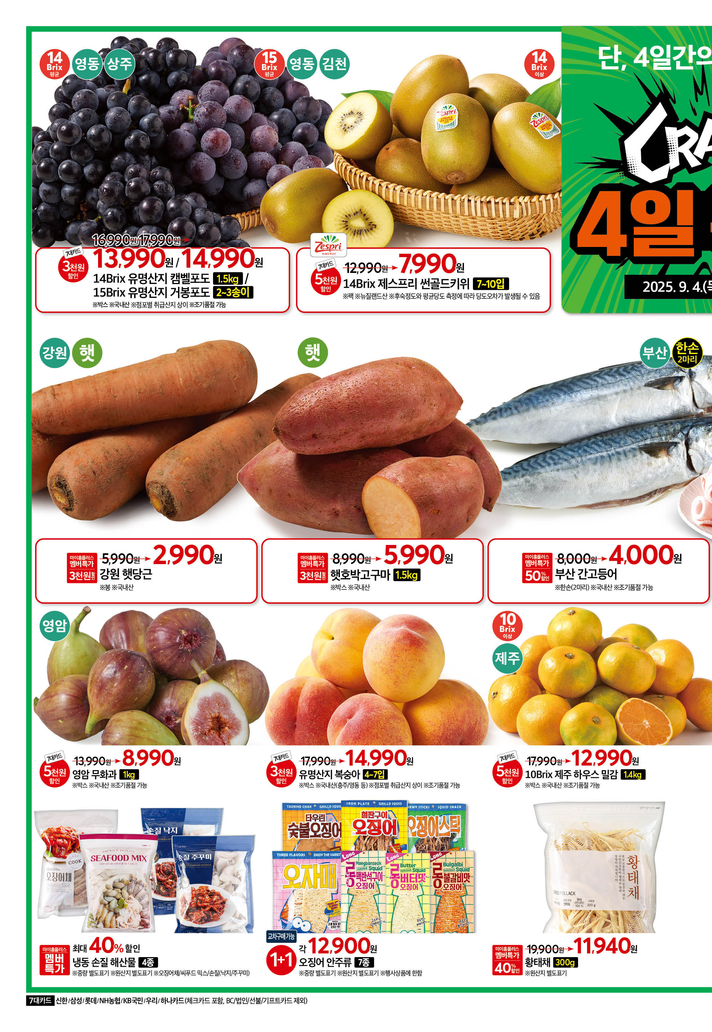 특히 9월 4일부터 7일까지 진행되는 'CRAZY 4일 특가'는 놓치면 후회할 특별한 기회입니다. 유명산지 햇 홍로 사과, 호주 청정우, 싱싱한 해산물 등 신선한 제철 먹거리를 놀라운 가격으로 제공합니다. 이 외에도 다양한 품목들이 준비되어 있으니, 이번 주 장보기 계획은 홈플러스에서 시작해 보세요.